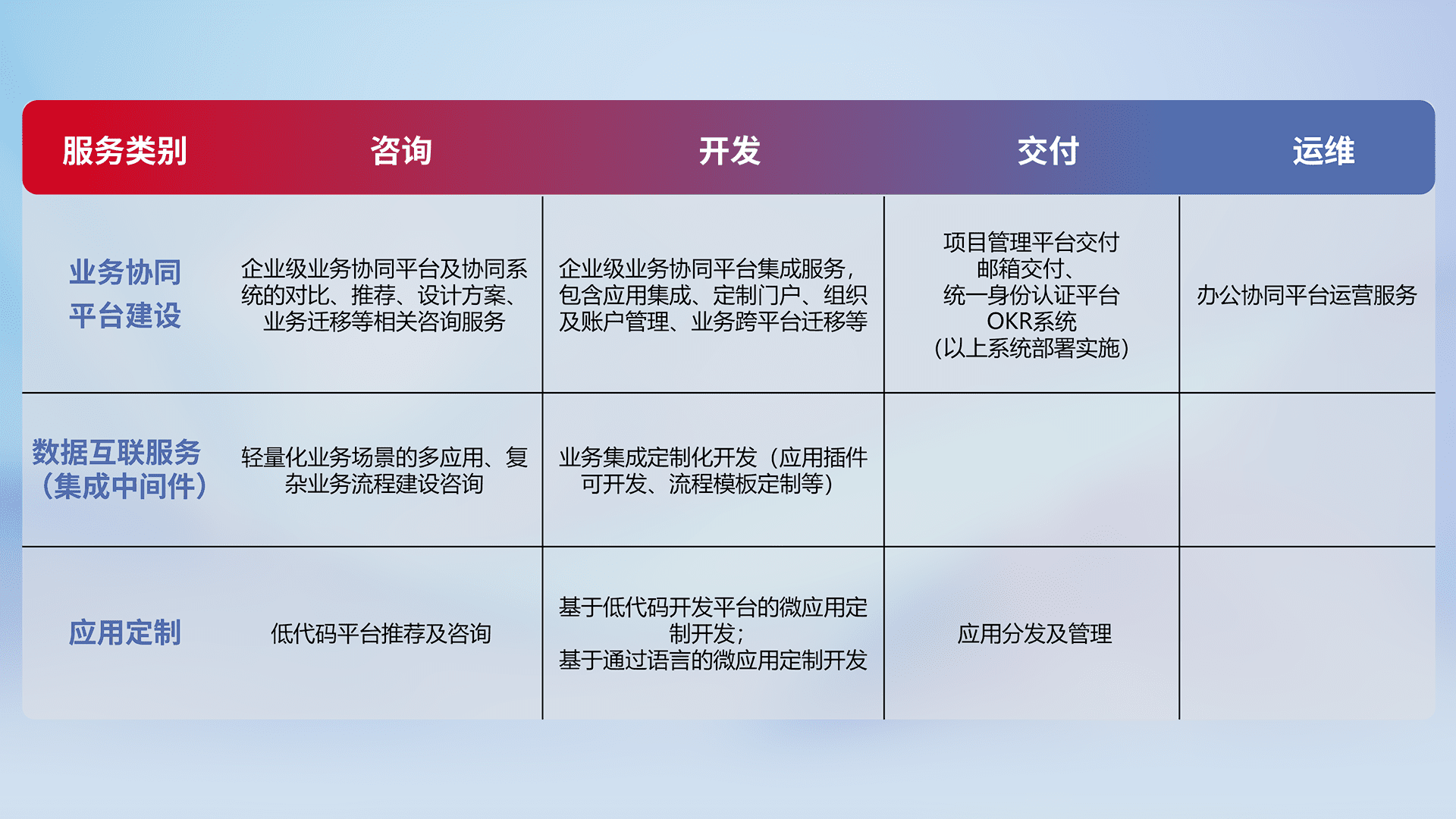 针对钉钉、、企微、、、IDaas等平台级产品提供产品的规划、、、方案、、交付、、定制化开发等服务,,,实现如统一协同办公、、、、智能客户服务、、、混合会议管理、、、、智能数据查询、、、等业务场景,,,实现数字化转型。。