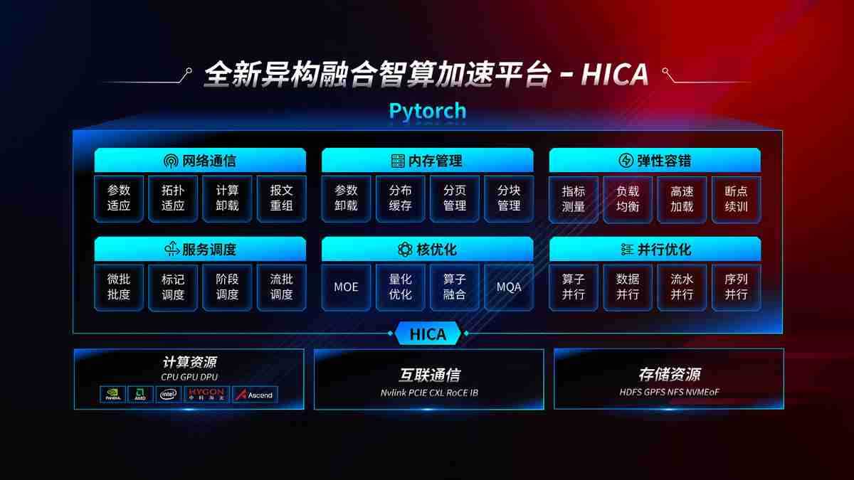 通过自研的服务层、、、中间适配层、、、以及调度编排算法,,,采用数据并行、、、、模型并行等多种并行方式,,,把并行计算任务进行有效的分解,,,使其分别由相应的软件栈和算力资源来承接。。。当GPU资源变化,,HICA可以实时动态调度计算子任务并调整模型拓扑和架构,,,以充分聚合各种算力资源。。。。
