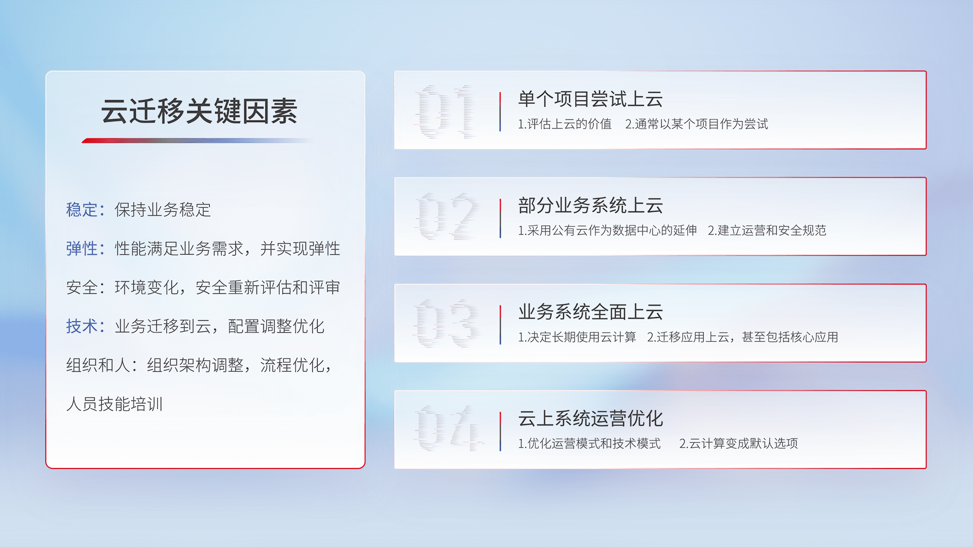 结合实际业务,,从规划设计、、、云平台选型、、、、云原生改造、、数据迁移、、、集成交付,,迁移全过程为客户识别最佳上云路径,,,做好风险识别管理,,,设计网络架构、、、、身份权限、、、、安全审计合规、、、、操作审计、、、日志审计、、、监控告警策略、、、、多站点容灾设计等,,,对云上基础设施进行整体规划,,,,提升IT治理水平,,以满足弹性、、、、高可用、、、高性能的需求。。。。