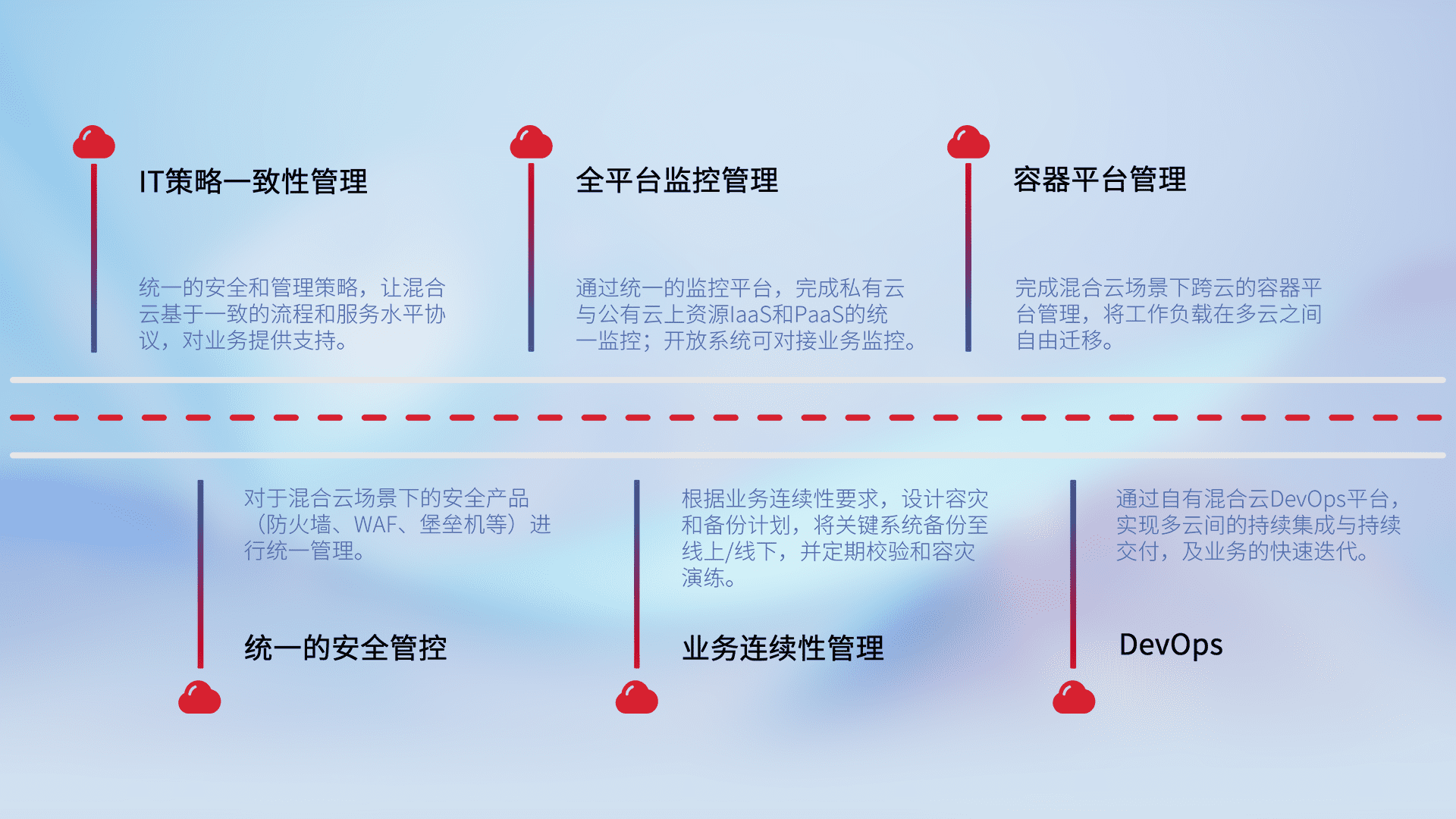 通过多云纳管,,,以统一的资源数据模型把客户的云资源进行抽象和封装,,进而实现对多云资源的统一操作,,,,保障云资源管理的可靠性、、、、稳定性与可用性。。。。量身定制化运维内容,,,,配置、、开发运维、、补丁管理、、备份、、监控、、、、认证和访问管理、、审计和日常巡检等,,,保障在用云过程中的可靠度,,,稳定度以及高可用率。。。。