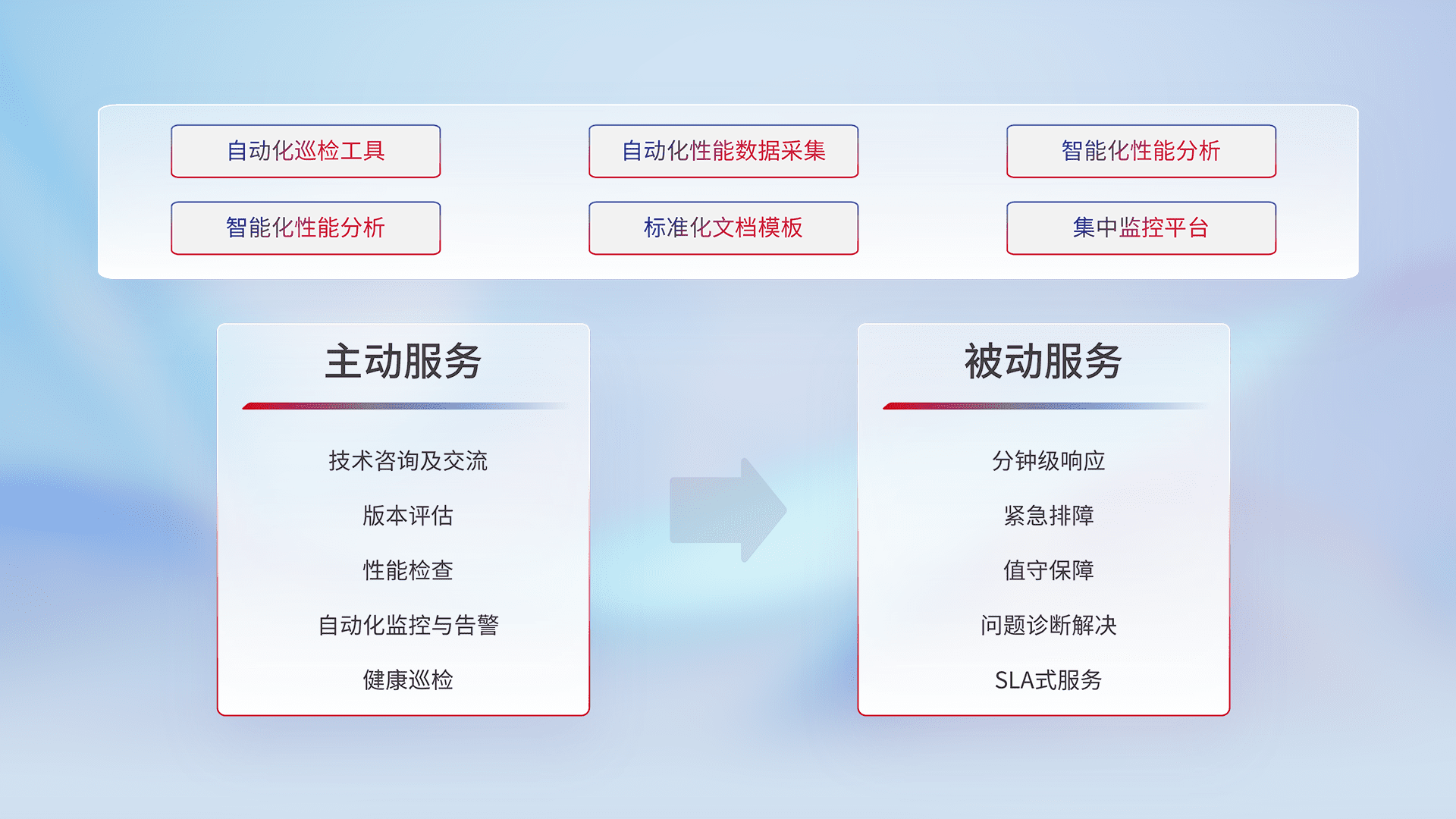 智能化工具和标准化文档,,保障服务质量,,,提供主动服务(包含技术咨询、、版本评估、、性能检查、、、、自动化监控与告警、、、健康巡检)和被动服务包含(分钟级响应、、、、紧急排障、、值守保障、、、问题诊断解决、、SLA服务)。。。